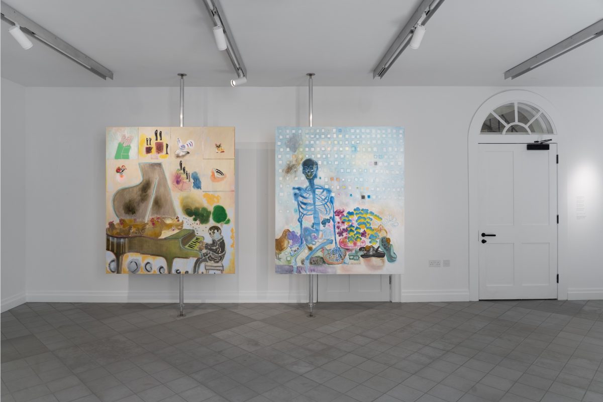 Throughout the exhibition, Duan develops a visual language that appears childlike yet is compositionally rigorous—both nostalgic and contemporary. She juxtaposes Chinese and Western traditions, high and low aesthetics, the sublime and the banal. Patterns from 1980s hotel menus, fish on dinner plates, chickens on pianos, the smiling face of KFC’s Colonel—all become components of her strategy of deliberate disjunction. What emerges is a fragmented, humorous, non-linear narrative reflecting the “fractured global reality” of our time.
