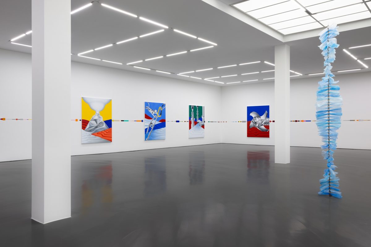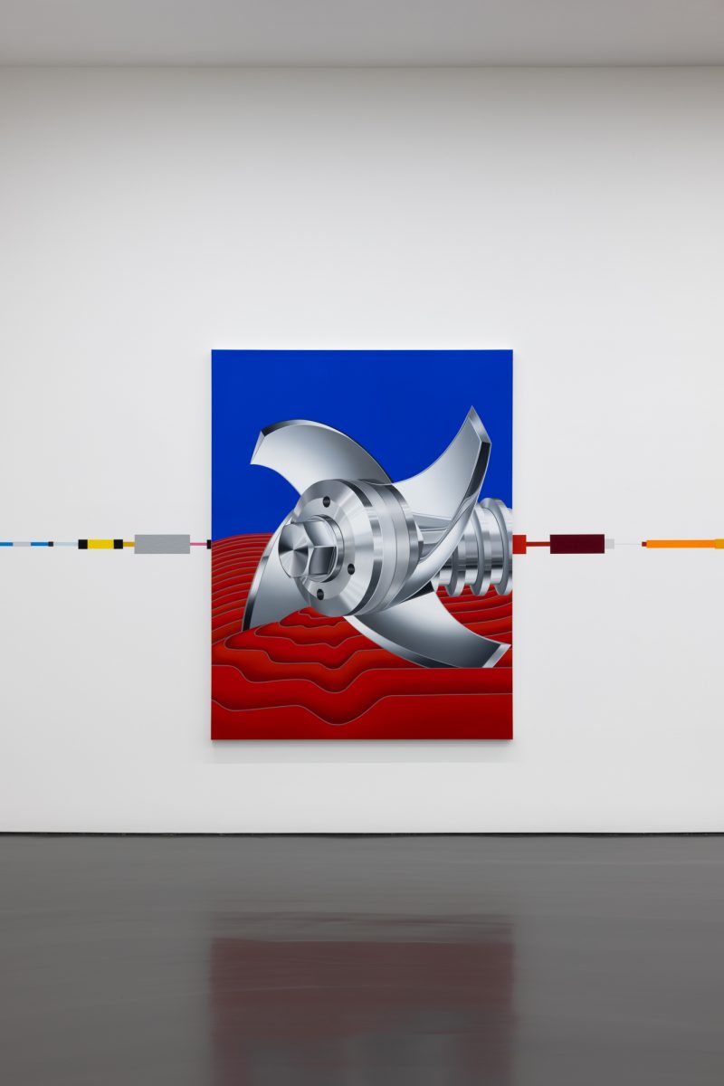 Six new paintings by Silvares are installed across Hip Hop, which runs through their core and resumes a connective horizontal line between them. Four large-scale paintings are hung sequentially; each depicts an abstract landscape comprised of viscous mounds that appear to unfurl slowly, interrupted only by the crisp contour of metallic objects. Metal is a recurring motif that exerts symbolic power; its hard, lustrous, reflective shell evokes the promise of modernity with its scientistic notions of cleanliness and the antiseptic. In Pillars (2025), a finely polished pipe empties a bulge of viscid silver into the painting’s foreground while Mill (2025) exhibits a helical screw blade. Titanium (2025) depicts a clenched tube facing it’s squeezed-out white paint; the silhouette is reminiscent of an hourglass and idiosyncratic for the artist’s seamless brush strokes. Hiperlink (2025) depicts interlocked snap hooks and pays tribute to Leirner’s trademark gesture of tying, clipping, or otherwise attaching products bought at hardware stores into extensive installations. As a can in vivid red is crushed inside a hydraulic press, time appears to stand still in Pole (2025). Suggestive of a crumbling pillar, the work’s vertical composition briefly halts Hip Hop, while tapping into Anthropomorphic’s tall, tranquil dynamic. Executed in oil, Silvares’s 808 (2025), depicts shiny and perfectly round knobs in aluminum grey, embraced by intense shades of red, yellow, and blue that read as another nod to Mondrian. Another reference, indicated by the work’s title, is the iconic drum machine Roland TR-808 Rhythm Composer, a bedrock of early hip hop samples.