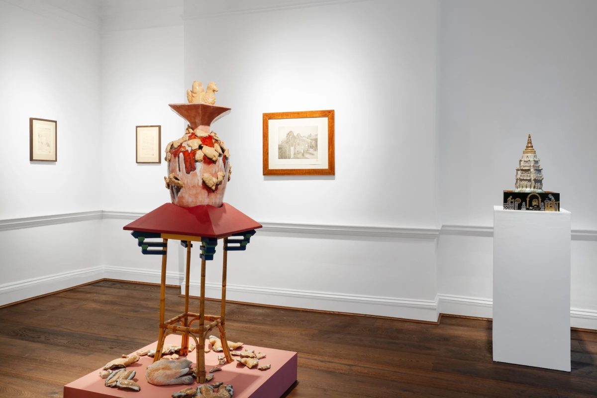 Lacquered vases, grand architectural models and broken shards of ceramic are all part of an exhibition that reflects on the artist’s dual Malayan-Chinese and English heritage. Incorporating traditional techniques such as Japanning and faux bois (the illusion of a wooden surface), she uses them to create fantastical narratives, including a snake in a drawer and a curled-up kitten under a sculpture. Until 16th December.