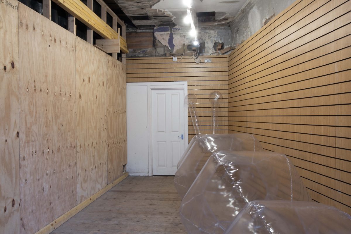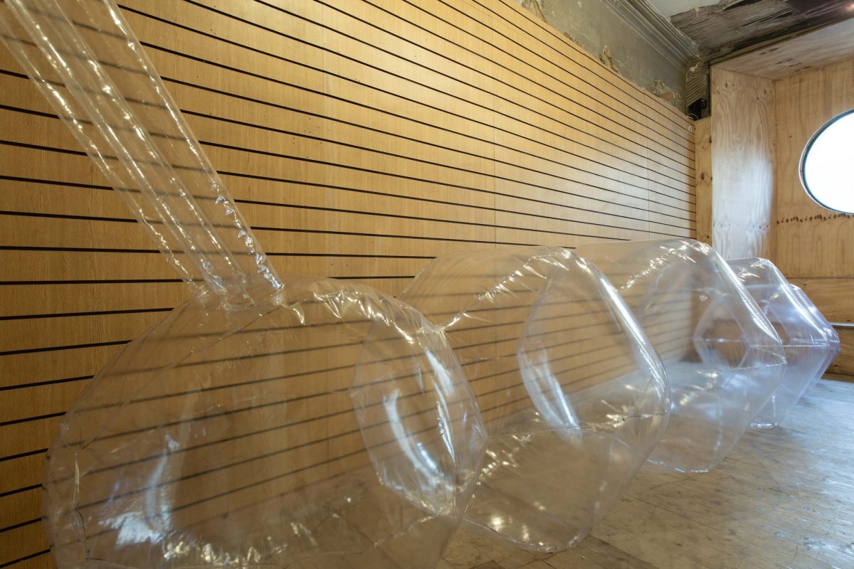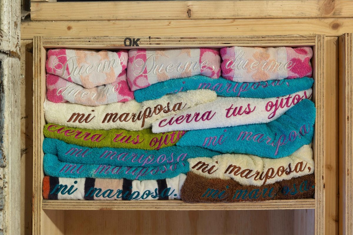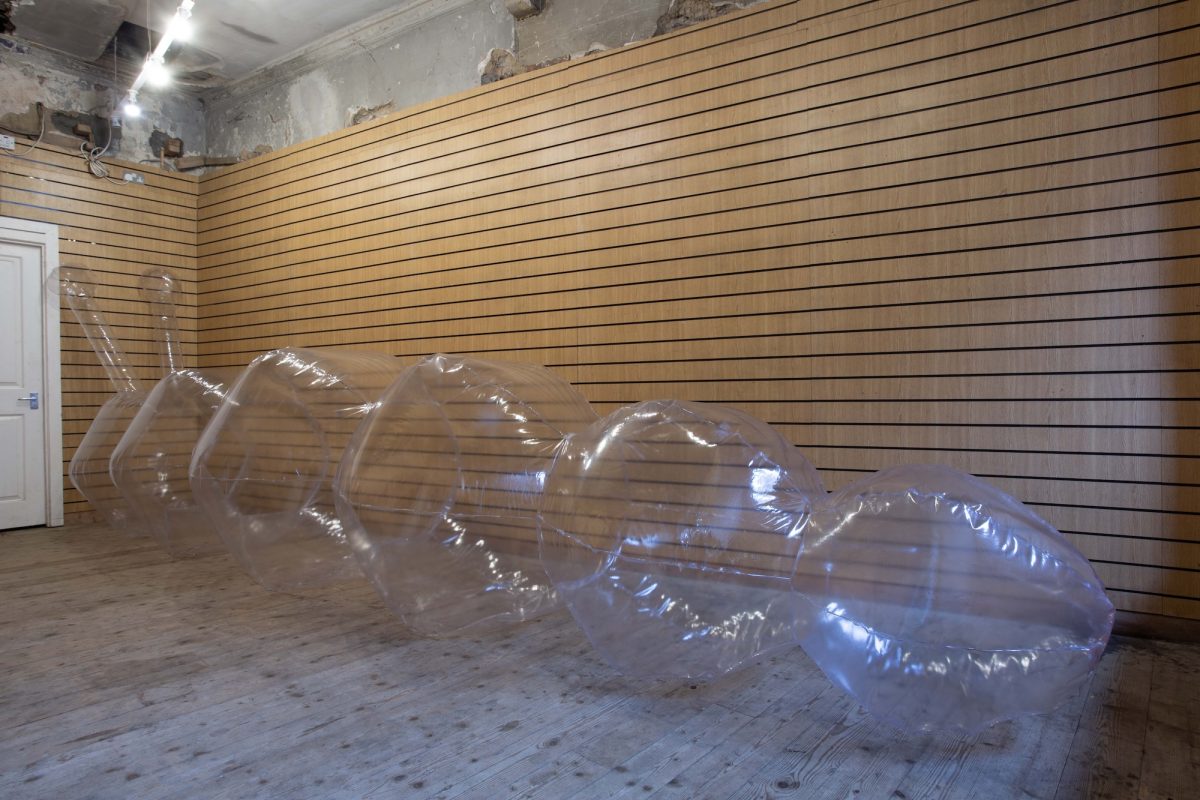 Not to be derogatory – to the pedestrian, Ottati’s current exhibition Chambers (at city gallery, Glasgow, until December 7th 2025) could seem rather What? – here we see nothing more than an oversized Koons-esque transparent inflatable caterpillar filling half the gallery, Blue skies (2025), its feelers touching up the back wall of the space. The discerning viewer, or at least one who looks at the exhibition’s work list, might also spot Lullaby (2025), a stack of resort-style beach towels sequestered almost out of sight high in one of the gallery’s built-in shelves. Embroidered with little princess italics to spell out a poem of sorts – ‘Sleep, sleep my butterfly, close your little eyes my butterfly, my butterfly, my butterfly’ – the materiality of Lullaby complements that of Blue skies, bringing to mind trope-ish images of summer beach holidays; the desire – the secret desire I dare say we all dream for – to throw down the inflatable and to recline in rays of scorching skin kisses. It’s a seductive mind image.