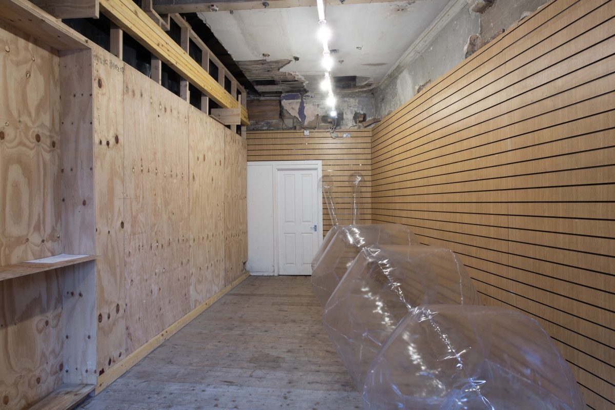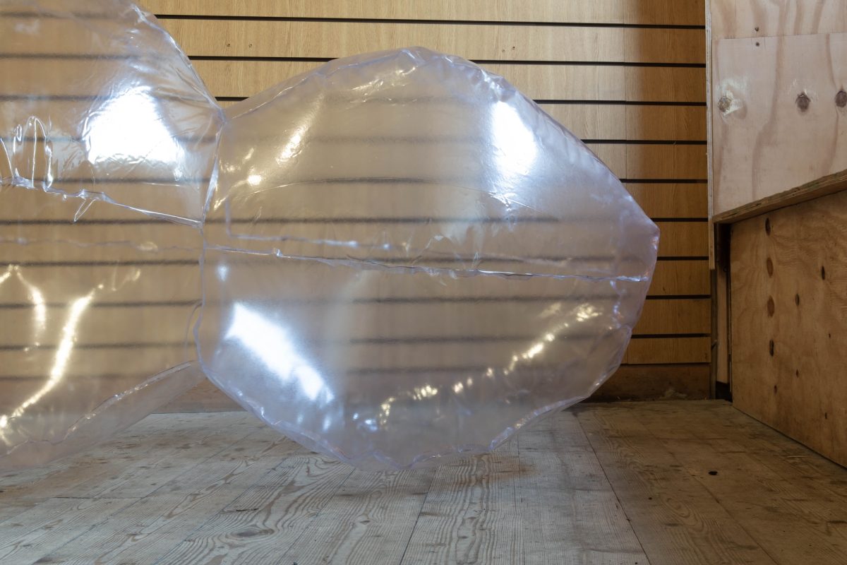 As with the original hedge, the sculpture of Blue skies has been meticulously crafted – cut and glued from PVC panels, with a “lot of maths involved”, so I was told. Further, filled with the artist’s breath, and in need of the occasional topping up via a beach-ball mouth valve, the work instantiates something of the daily labour involved with caring for a beloved – be that a person or, in this case, the body of an infatuation – the relational labour that is love. When thought of as a metaphorical object representing such acts of maintenance, Blue skies gives form to otherwise invisible routines of care and affection; what it takes to tend to another, how such work feels both precarious and rewarding, as well as to how much life space these efforts take up. Indeed, as Ottati’s caterpillar looks hard into the wall of the gallery, the physical placement of the work seems allusive of the way these labours are overlooked, embodying the bittersweetness of any love act.