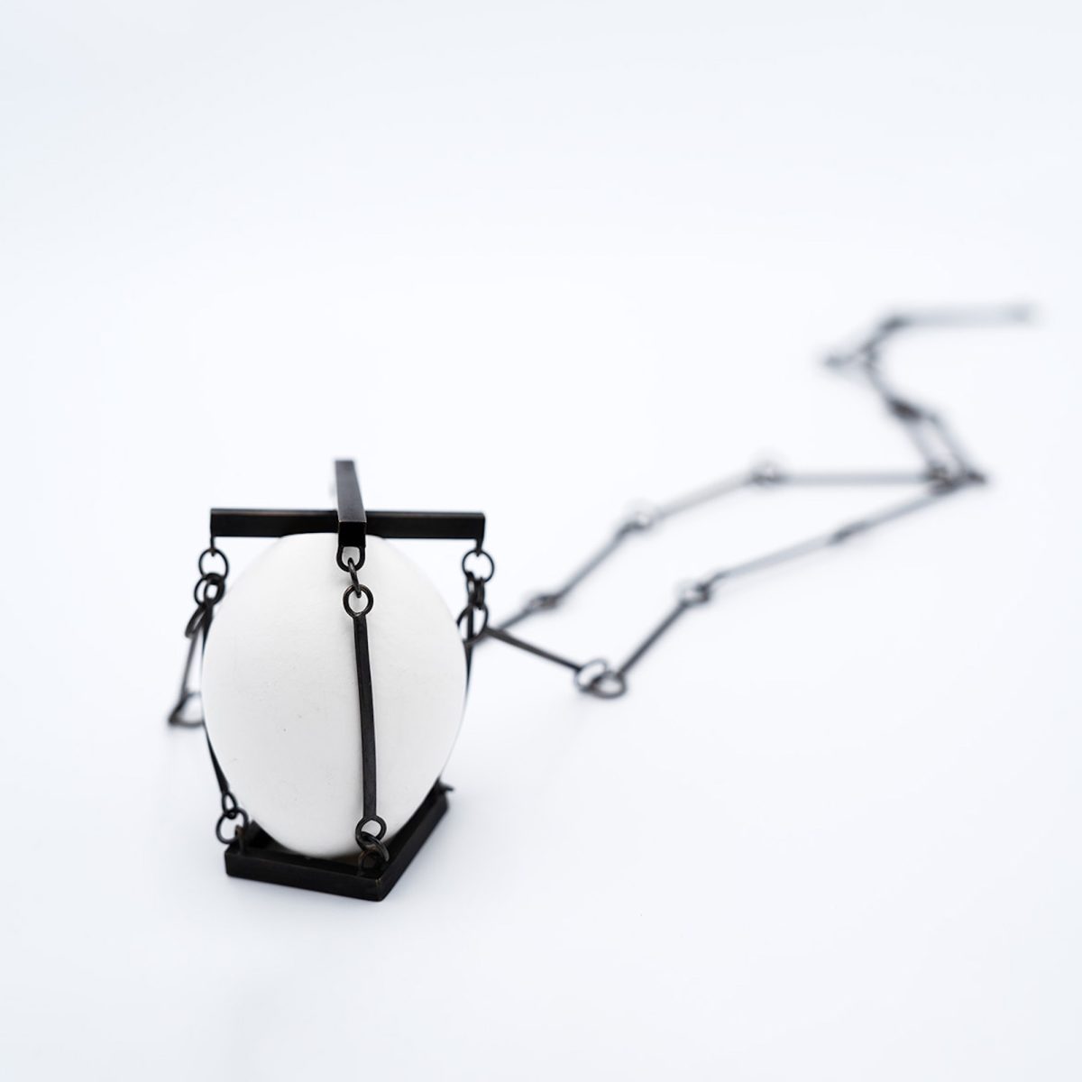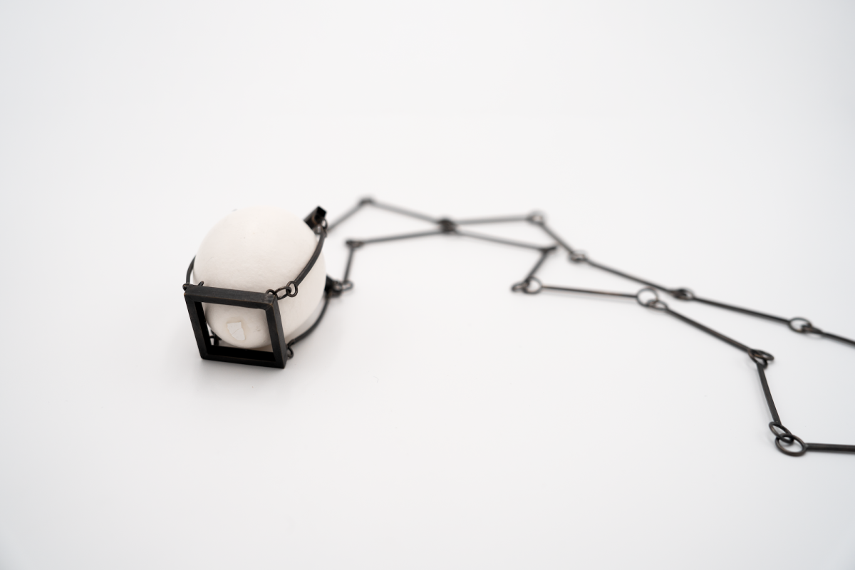 Against this background, EDGE PRISON occupied a central position in the series as its main thematic piece. Chufei chose eggshells for their smooth tactility and inherent fragility, using them to represent parts of the self that require protection. In EDGE PRISON, the eggshell is housed within a small metal cage that allows it to shift slightly without falling or breaking. The contrast between metal and shell, the carefully controlled empty space, and the piece’s suspended posture create a visual balance that feels stable yet charged with latent uncertainty. When worn on the body, the eggshell is securely contained, activating a controlled sense of instability; when presented as an installation, the shell can be removed freely, and the former constraint dissolves. Through this shift, the work makes visible how vulnerability behaves differently on the body and in open space.