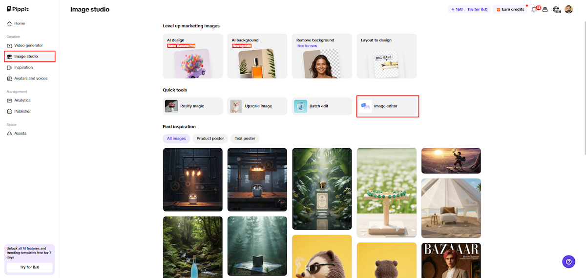 You begin by heading to “Image Studio”, then jumping into the workspace through “Image editor.”