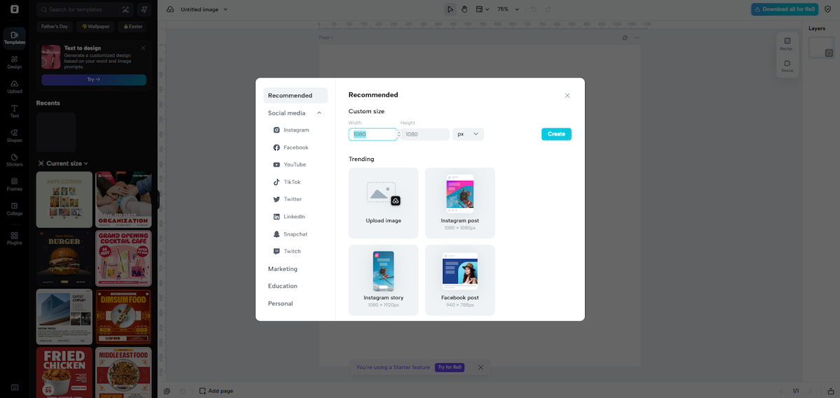 You upload your crisp, high-resolution picture by clicking “Upload” or dragging it into the editor window. You can choose a custom size or pick from the recommended options. This sets up your photo for a clean retro downgrade.