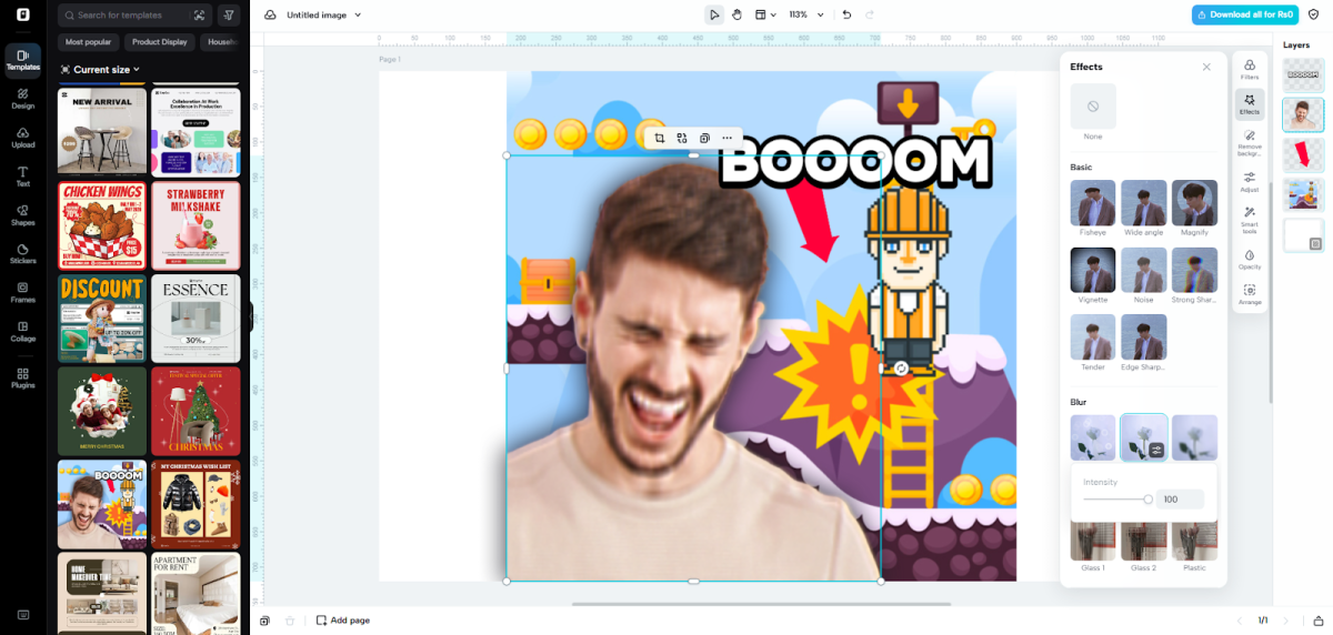 To create a nostalgic low-res effect, you go to “Effects” in the left toolbar. Then you click “Blur” > “Low quality” to lower clarity intentionally. With the “Intensity” slider, you adjust how heavily the photo shifts into a retro, pixelated look. Slide to 100 if you want a deep throwback appearance. You have full control over how far you want the degradation to go.