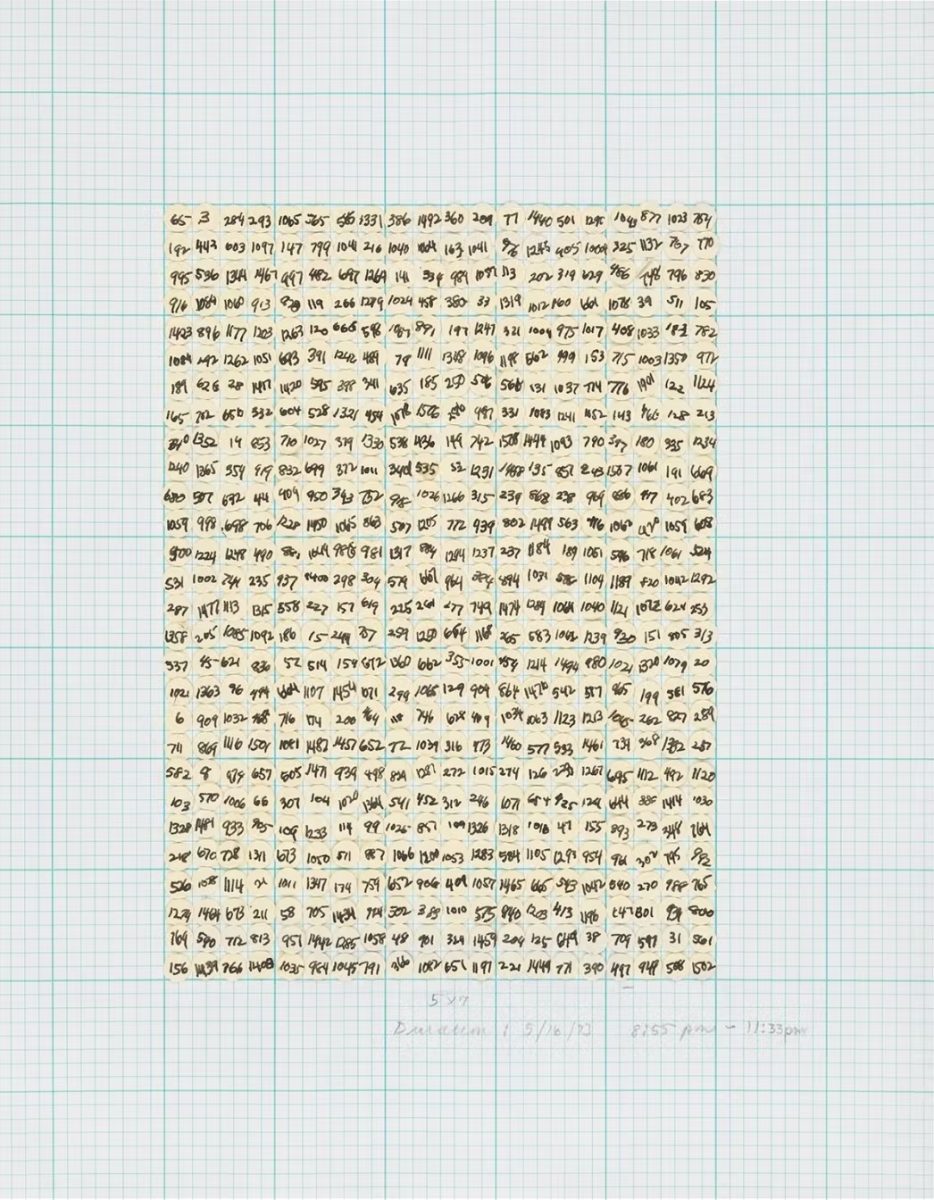 This is from White Cube Bermondsey’s comprehensive account of pioneering black American artist Howardena Pindell’s practice: it includes all three of her exceptionally hard-hitting films dealing with racism, as well as many recent and some older paintings. Here she plays with both the grid and the role of numerals in 1970’s conceptual art, which tended to employ them for measurement (e.g. Mel Bochner) or ordering (e.g. Roman Opa?ka). Pindel randomly sequences 560 numbers, for each of which she had to take a ready-cut chad in a pair of tweezers with one hand while writing on it with a technical drawing pen with the other, then laying it onto the graph paper’s grid. Her annotation states that it took 2 hours 38 minutes – fairly fast work, I’d say, at some 20 seconds per number. The systematic and impersonal style typical of minimalism is undermined both by the apparently arbitrary choice of numbers, which don’t go 1-560 but include many higher values, rendering them an incomplete part of a larger set; and by an open embrace of errors and visible corrections (and coffee spills on some comparable works).
