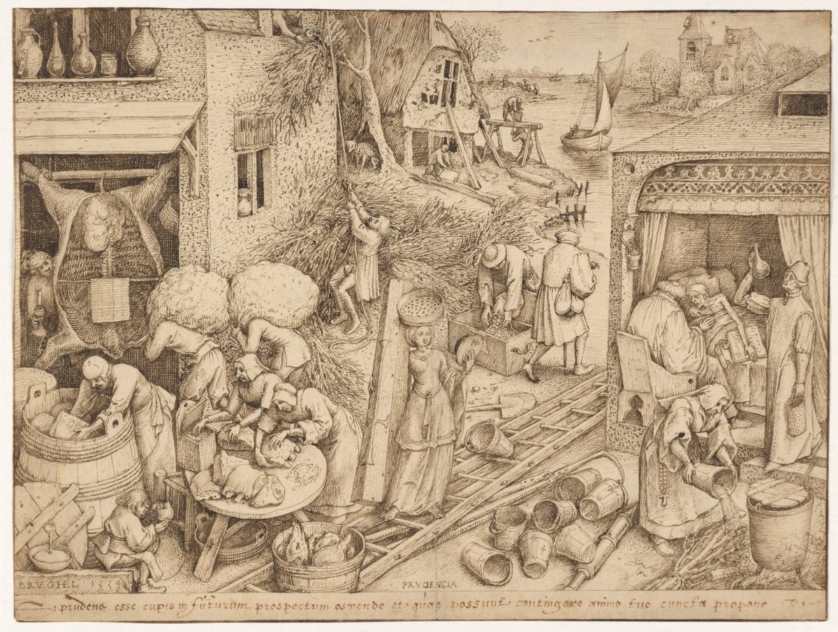 Among the exhibition’s centrepieces is Bruegel’s drawing of Prudence from his celebrated series of the Seven Virtues. Rich in detail and observation, it marks a shift from his earlier Bosch-like fantasies towards the everyday life of peasants preparing for uncertain times — storing food, repairing buildings and gathering firefighting tools. The drawing will be shown alongside two related Bruegel prints from the Ashmolean, offering rare insight into how his images circulated.