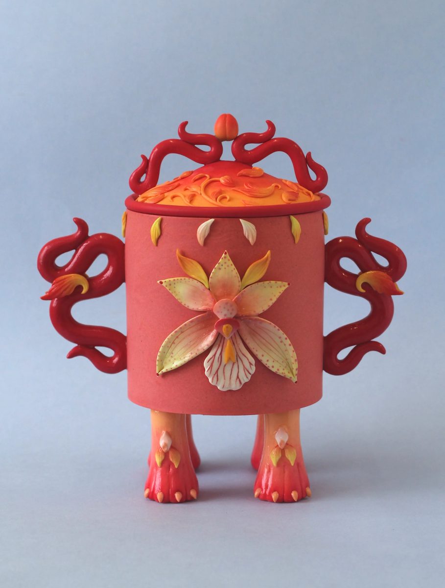 Fire Orchid and Moon Moth Snu? Bottle by Hannah Lim Fire Orchid and Moon Moth Snu? Bottle 2025 Polymer clay, jesmonite, chalk, acrylic paint, gloss 16 x 17.5 x 10 cm