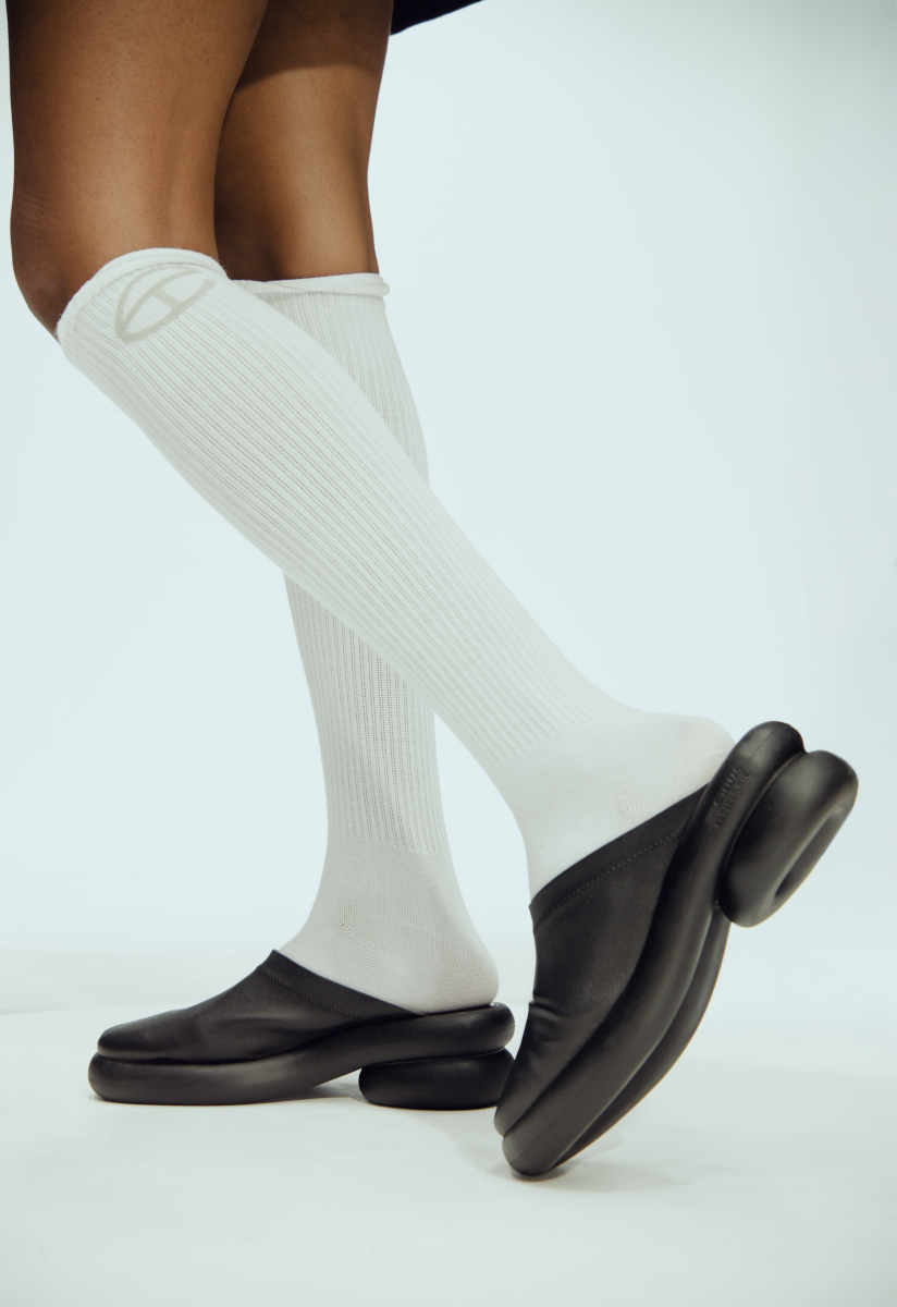 Completing the trio, the Modular Mule adapts the same coiled sole into a slip-on format, available in nappa leather or ribbed knit. Positioned between clog, wedge, and slide, it continues the system’s emphasis on versatility across styling and gender expression.