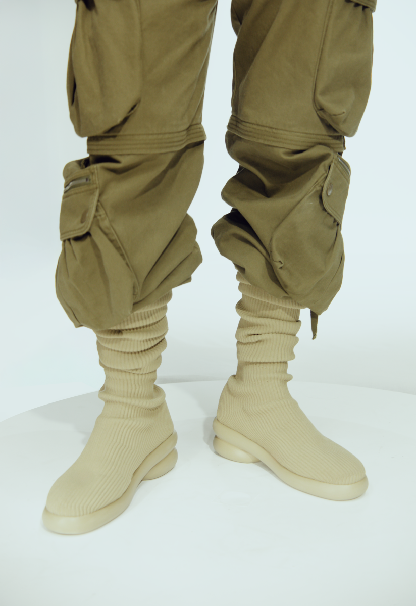 The Tall Modular Boot, cut in stretch ribbed knit with a leather logo pull, is designed to shift in attitude depending on how it’s worn. Fully extended, it reads as a statement boot; slouched, it softens into a stocking-like silhouette; scrunched or tucked, it veers toward utilitarian. Colour options include black, white, drab, and red.